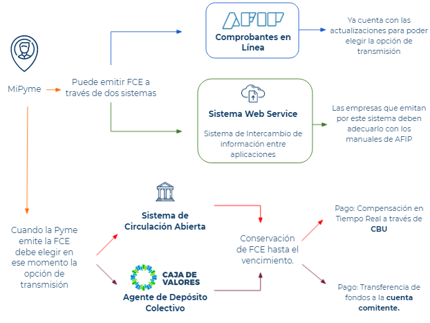 La dinámica de funcionamiento es la misma a la de un Echeq. Al momento de emisión de la Factura, la Pyme deberá elegir a qué circuito de operación la va a transmitir, si al de Circulación Abierta o a un Agente de Depósito Colectivo, a continuación, el proceso completo: